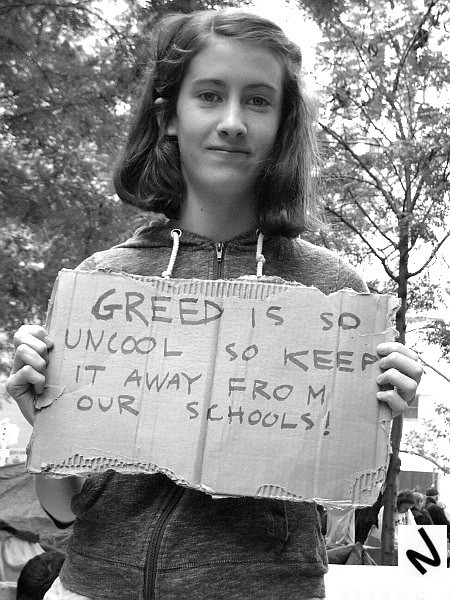 Zuccotti Park is a tough shoot. It’s very dark in the interior and very bright and glary on the periphery. I like to shoot there on Sundays when there is no pressure to “get the shot.” It’s nice to have time to talk with people, hear their stories, and try to do a portrait or two. As I told one woman, Sunday is about the people. Even the police seem to understand that Sunday is a good time to observe a truce. Maybe one day that truce will be formalized into an armistice and the false binary that is the Police Department vs. Participatory Democracy will be ended.