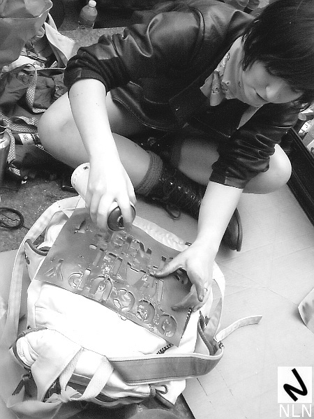 An activist does a bit of stenciling for someone visiting the encampment