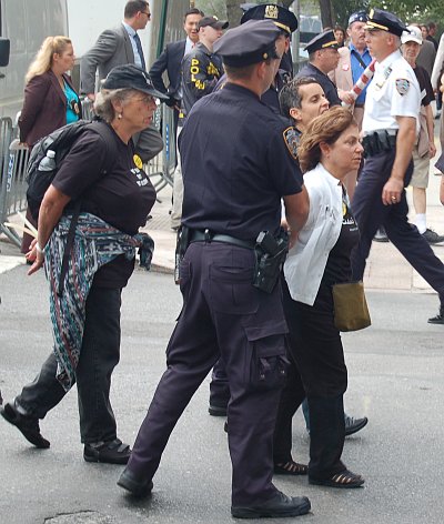 After the arrest of Rice and Millard, the remaining protesters formed a line in front of the barricades and began chanting: “Arrest Bush, torture is illegal…” and “Bush is a war criminal, we will not be silent”. Police sealed the area - pushing press into pens - and brought in vans and uniforms armed with flex cuffs. NYPD Lt. Wolf issued an order to disperse through a bullhorn and then ordered the arrest of the 13 nonviolent activists. The 13 arrested in the second wave of arrests were all processed at Midtown North (on 54th Street) were they were charged with disorderly conduct and given DATs (desk appearance tickets). They will be arraigned on October 17th at 100 Centre Street. Ironically, this is the anniversary of the Times Square Recruiting Center arrest of the Granny Peace Brigade - a case they ultimately won.