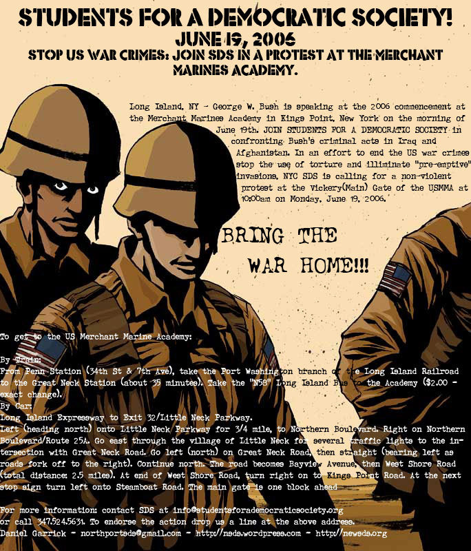 NEW YORK, NY - George W. Bush is speaking at the 2006 commencement at the United States Merchant Marine Academy in Kings Point, NY on the morning of June 19. Join Students for a Democratic Society and friends in confronting Bush’s criminal acts in Iraq and Afghanistan. The recent revelations of atrocities in Haditha and Ishaqi and elsewhere clearly reveal the barbarity of the US Government’s actions. In an effort to end the US war crimes, stop the use of torture and eliminate “pre-emptive” invasions, SDS New York City is calling for a nonviolent protest at the Vickery (Main) Gate of the USMMA at 10:00 AM on Monday, June 19, 2006.