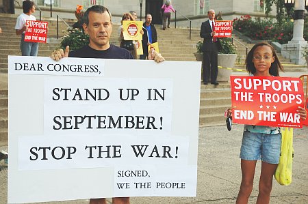 “Bush is playing three card monte again - telling voters and Congress that the ‘surge’ is working. I grew up in during the Viet Nam war, I’ve heard all the lies before. It’s time to get our people home before we lose any more lives in a war based totally on lies,” said Tom Good, an organizer with Movement for a Democratic Society (MDS). “I have a twelve year old son. I want more for him than endless war,” he added.