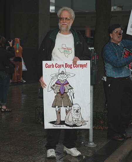 And, as far as the growling pack of protesters is concerned, that’s exactly where Corn Dog Cornyn deserves to be: in the doghouse.