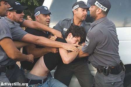 Once the march stopped at the gates of the Pepsi Center, where the repressivwe forces were waiting, machine guns in hand, Ron Kovic told everyone to sit down, and show determined defiance of the police state. Hundreds did, right in front of the gates, and it remained that way for about 15 minutes. He gave a rousing speech, and activists were chanting and yelling. Rising, the protesters remained directly in front of the Center, demanding they be heard. The standoff with 1,000 protesters and the police became a very tense situation, and both sides were ready for whatever would happen next.