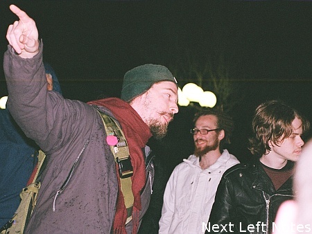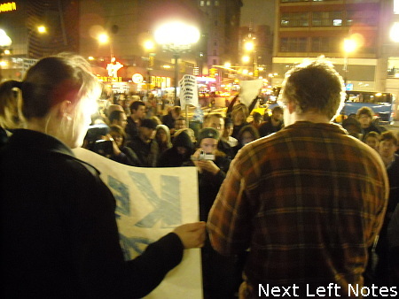 A rally to support the jailed students was held at Union Square at 10 p.m. on Good Friday. After a press conference supporters marched to Bob Kerrey’s home and shouted demands for him to step down as police looked on. The marchers were headed for 65 Fifth Avenue, the New School building the students had occupied, when a scuffle with police resulted in two arrests. Chris Crews, a journalist and grad student at the New School was filming one of the arrests when a police officer punched his camera, cracking the housing. Crews salvaged the video and posted it on YouTube.