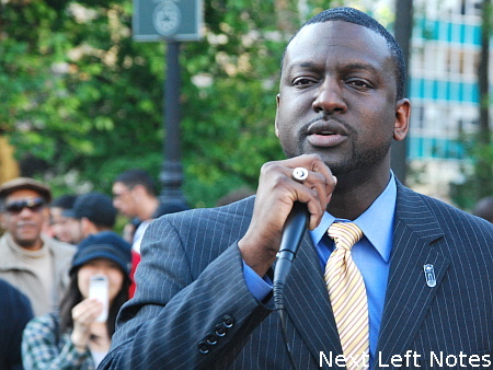 The greatest flaw in the logic of the death penalty — the potential for error in assigning guilt — was embodied in the person of Yusef Salaam who attended the rally to speak out in defense of Troy Davis. Salaam was imprisoned in 1990, after being wrongfully accused and convicted. He was eventually exonerated — but AFTER his release from prison. In 1989, Salaam was a member of the so-called “Central Park Five” — five teenagers who were accused of raping the “Central Park jogger” (Trisha Meili). The teenagers were arrested, convicted and imprisoned in 1990 but were cleared of wrongdoing, by DNA evidence, in 2002 — after they had all completed their sentences. Salaam told the crowd that despite his ordeal he refused to be a victim and remained “standing strong”. Salaam said that he fully supported Davis — another wrongfully accused person whose life was placed on hold by a broken criminal justice system.