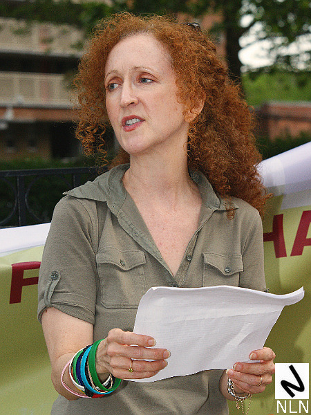 Then Suzanne Kelly read a statement from Wallace Shawn and Deborah Eisenberg: “It is obviously not irrational for Americans to be afraid of terrorist attacks or to try to prevent them. But if you don’t arrive at a rational approach to prevent these attacks we will find ourselves falling to the lowest level of a police state with the speed of an elevator whose cables have snapped. At the start and at the finish of the Hashmi case tricks of the theater have been used to make a human being look terrifying to an audience by the extreme conditions by which he was restrained. He was made to look like a dangerous animal, so ferocious that only the tightest and thickest chains could keep him from eating us alive. By the methods of isolation that kept him from communication with the outside world, his words were made to seem so poisonous, so hateful and terrible, that if they could be heard they would knock down walls and devastate cities. It could appear that he belonged to a movement so vast and so mighty that it had more power than the greatest criminal gangs to strike down it’s enemies wherever they might hide. In the face of these frenzied theatrical devices that not only presumed the guilt of the defendant but screamed it out across the public square, it is hardly surprising that the defendant has lost faith that our system of justice is really based on the presumption of innocence. Faced, therefore, with trying to prove a negative, that he is not a terrorist, to the satisfaction of a terrorized jury, he has decided to withdraw his claim of innocence. Meanwhile, down the street the criminals of high finance who have undoubtedly caused the suffering and even death of countless human beings go unpunished and instead are rewarded with prizes of untold wealth.”