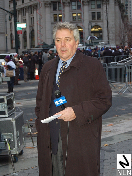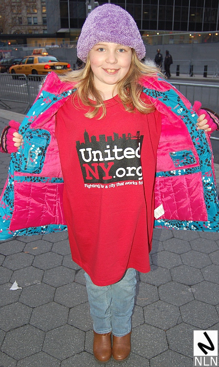 Centre Street was lined with media broadcast vans. I asked a reporter from CBS if I could photograph him. He said, “Sure, thanks for asking — we don’t do that.” I said, “Oh, I know..” and took his picture. This section of the square was full of reporters: My9, CNN, Noticias, Eyewitness News, etc. Many of the TV journos were doing stand ups as my daughter and I walked past. We grabbed some free t-shirts from the UnitedNY.org table and went looking for my union.