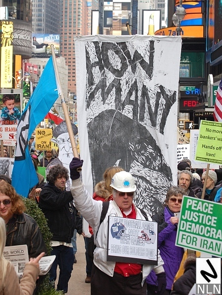 The Iranian nuclear program is the rationale for what War Resisters League member Ed Hedemann calls “saber-rattling” by the U.S. Hedemann and other WRLers marched in a protest on Saturday, demanding an end to U.S. military interventions. The march began with a rally at Duffy Square — the northern edge of Times Square — at which some organizers spoke and the WRL displayed oversize vertical silkscreened banners which asked, “Why?” and the more ominous, “How Many?”