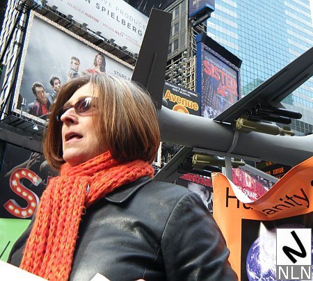 Prior to the march, Debra Sweet, a World Can’t Wait organizer, addressed the crowd in Duffy Square, in the style of an OWS “mic check” — a call and response mechanism designed to make speeches audible without using amplified sound.