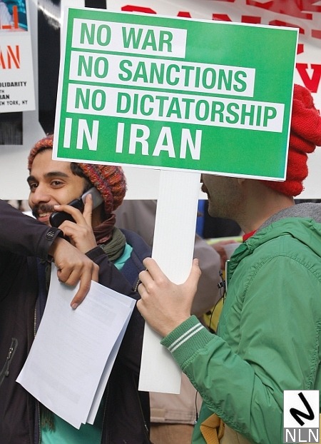 Also at the protest but with their own message were members of a group called “New York Area Iranian Green Movement Activists.” Group members held signs demanding “Peace, Justice, Democracy for Iran” and “No Sanctions, No War, No Dictatorship in Iran.”