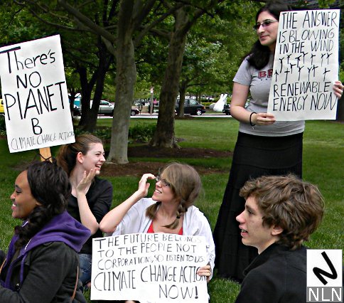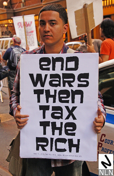 While the trade unions and community organizations on Staten Island were rallying, their counterparts on the other side of New York harbor were also protesting. The War Resisters League, The Granny Peace Brigade, The Rude Mechanical Orchestra and even Billionaires for the One Percent were all on hand to mark the passage of another tax day. The WRL and friends carried signs that read: “End the wars, then tax the rich…”