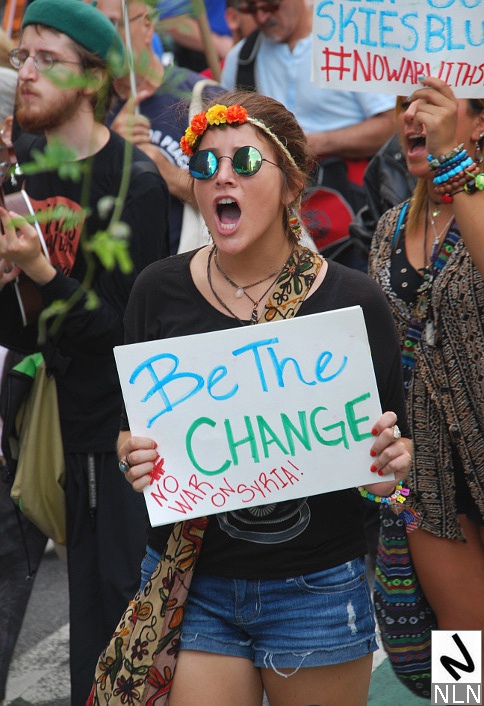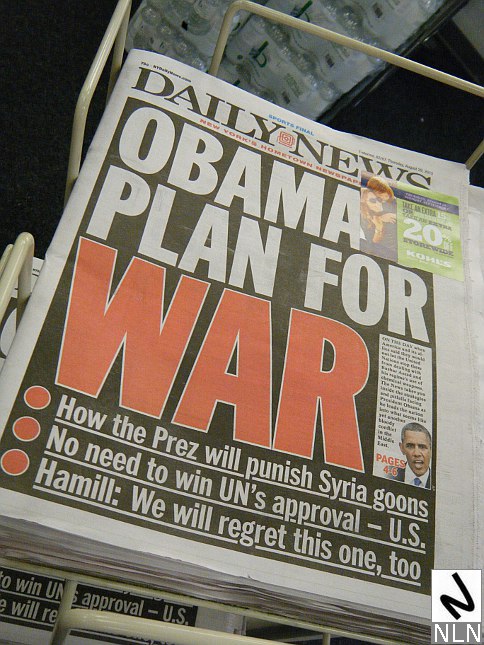 Recently, President Barack Obama has been working the Hill and lobbying world leaders, looking to garner support for a U.S. military intervention in war torn Syria — in response to Syrian President Assad’s alleged use of chemical weapons. But the response to Obama’s intense lobbying efforts has been overwhelmingly negative. Whatever rationale the President has offered has been met with opposition from the majority of the war weary American people who regard Syria’s troubles as “not our business” — and a fair amount of overt cynicism as well: apparently a ruse by any other name has an all too familiar odor. A “limited strike” has the potential for blossoming into a full blown conflict. And then there is the irony of a Nobel Prize winner — who just last week honored Martin Luther King, Jr. — stumping for a new war. Obama’s rhetoric hasn’t sold well and on Saturday several hundred New Yorkers took to the streets to demand that the United States maintain a “Hands Off Syria” policy.