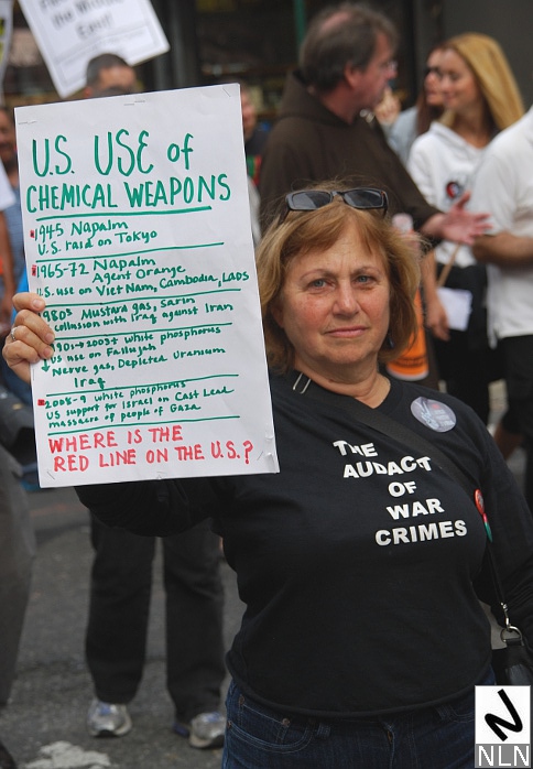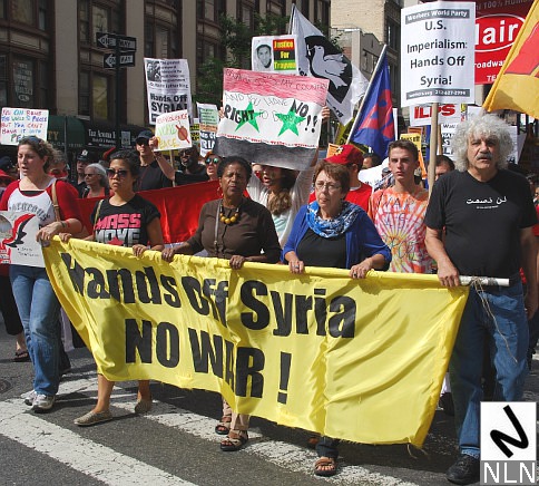 NEW YORK — September 9, 2013. Saturday’s “Hands off Syria” protest in NYC featured signs calling for respect of international law — and opposing yet another unilateral U.S. military intervention in the Middle East.