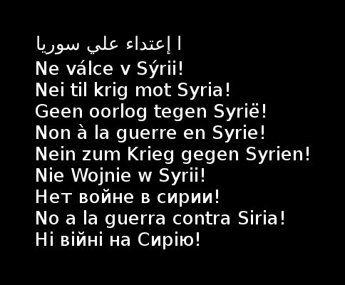 Saying no to war in Syria in Arabic, Czech, Danish,