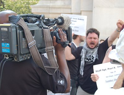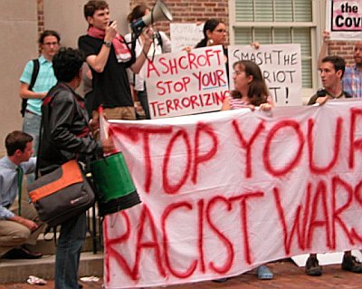 The civil disobedience action was organized by the “Bush Crimes Commission” and “World Can’t Wait”. Participants in the action included the Granny Peace Brigade, the We Will Not Be Silent movement and Iraq Veterans Against The War. Protesters included: Ann Wright, a former State Department official who resigned in protest of the Iraq War; Elaine Brower (WCW), whose son is a marine serving in Falluja; Father Luis Barrios of St. Mary’s Episcopal Church, Clark Kissinger (RCP/WCW), Beth Lamont, the American Humanist Association’s UN representative; Beverly Rice, Carol Husten and Ann Shirazi of the Granny Peace Brigade; Laurie Arbeiter of We Will Not Be Silent and Geoff Millard of IVAW.
