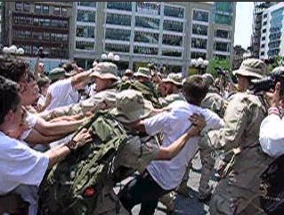The demonstration began with a group of “Iraqi” protesters clad in white tshirts. They approached the south steps from the west side of Union Square waving fists and shouting. A platoon sized contingent of IVAW, in battle dress - some carrying full packs - advanced cautiously on the protesters from the east. The IVAW vets held their arms and hands where they would be if the actors were carrying weapons. A confusing scene of shouting and protesters being thrown to the ground ensued. Protesters were forced to the pavement, searched and cuffed in nylon flexcuffs all too familiar to many New York City protesters. Eventually the IVAW contingent withdrew pointing their “weapons” at the protesters, some of whom lay still on the ground - handcuffed in the prone position. Media ran to and fro - taping the display for evening news broadcasts. According to the IVAW website - the action was entitled Operation First Casualty “because truth was the first casualty of the Iraq war. It is time for the American people to know the truth so they will act to bring the troops home now.”