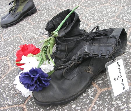 New York, NY - August 7, 2007. The visually striking “Eyes Wide Open” display made its way to Staten Island’s Midland Beach on Tuesday, August 7. The exhibit, organized by Peace Action Staten Island (PASI) and Movement for a Democratic Society (MDS), was planned as a separate part of the larger “National Night Out Against Crime” - an event sponsored by Staten Island’s three police precincts. Eyes Wide Open has as its centerpiece a collection of military boots. Each pair of boots bears a tag with the name of a soldier killed in Iraq. The exhibit was put together by the American Friends Service Committee (AFSC) and was on loan to PASI and MDS. All of the military personnel represented are sons and daughters of New York and New Jersey.