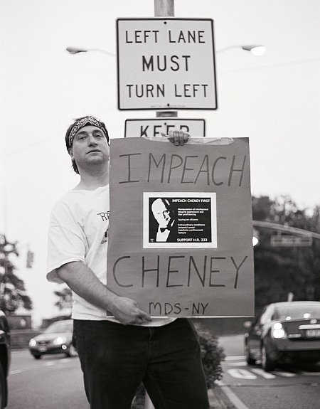 New York, NY - August 3, 2007. Members of MDS New York were joined by friends from Peace Action Staten Island in a protest calling for the impeachment of Dick Cheney. Protesters stood along busy Richmond Terrace, opposite the Staten Island Ferry terminal, as drivers passing by honked in response to signs saying “Honk For Impeachment” and “Impeach Cheney First.” This was the second impeachment protest outside Staten Island’s Borough Hall this summer and more protests are planned according to MDS. The response from passing motorists was very positive and everyone had a laugh as protesters tooted their own horns, bicycle horns that is, as a means of grabbing the attention of drivers sitting at the traffic light or emerging from the Ferry Terminal.