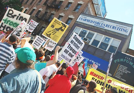 New York, NY - August 18, 2007. Emotion was palpable at the Washington Heights protest on Saturday, August 18. A sea of young faces, the majority of the protest contingent, complimented some familiar faces from a number of Left formations - that don’t often work together. A boistrous rally at Bennett Park preceded a militant march to Highbridge Park. Along the march route, protesters stopped at the home of a fallen soldier from the Heights for a moment of silence. A bit further on, the Army recruiting center was surrounded by bullhorn wielding youth as passersby and police looked on. The march resumed and paused yet again at the home of another lost son from the neighborhood. The marchers had clearly had enough of the military preying on their friends and neighbors. Shoppers and other community members who ventured out on a beautiful New York City day expressed solidarity with those who took to the streets to denounce the military’s attempt to hustle their sisters and brothers - offering a war in Iraq under the guise of a college education and financial security. NLN was there and captured the moment in video and photographs. It was an event that inspired all present.
