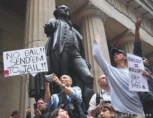 Signs read “No Blank Checks For Wall Street” and “Our Hard-Earned Pensions Are Not Up For Grabs.” Protesters cheered repeated calls for the government to spend money on education, health care and housing as freely and readily as it was proposing to do for Wall Street.