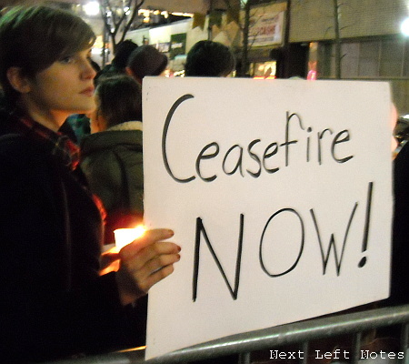 United for Peace and Justice, CodePINK, Peace Action of New York State, the American Friends Service Committee, World Without Wars and other groups held the candlelight vigil to demand the U.S. join the international call for a ceasefire in the Gaza strip. The groups also demanded “unimpeded humanitarian aid for the people of Gaza,” arguing that, “there is no military solution to the crisis in Gaza, Iraq or Afghanistan. A negotiated settlement is the only way to end the death and suffering.”