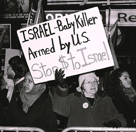At the time of the arrest, a larger demonstration was being held a short distance away — several hundred demonstrators filled protest pens lining Times Square, in front of the hotel. The demonstrators had gathered to denounce the fact that the annual American Israel Public Affairs Committee (AIPAC) fundraiser was being held inside the Marriott. The $1500 a plate dinner was meant to be a gala affair, one that would allow the pro-Israel AIPAC to use its financial clout to influence U.S. foreign policy.