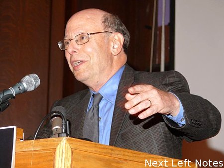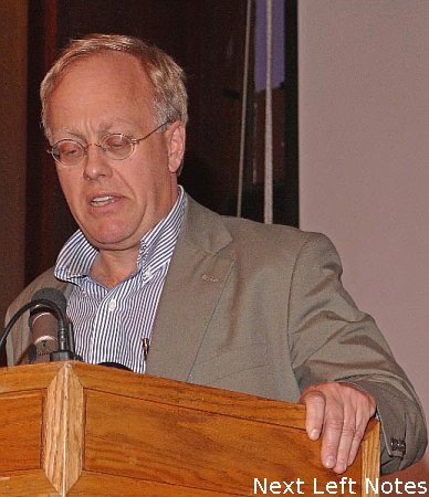 Sheehan spoke for an hour and focused on four main themes: the “System” itself is the problem, the crimes of Bush and Cheney should be prosecuted, the myths that perpetuate consumerism and false consciousness must be debunked, and the people need to start building a revolution from below. Tying it all together: the idea that a “robber class” is preying on a “robbed class”. Haves and have nots described in language that recalls Bertolt Brecht’s famous quip: “Which is the greater crime — to rob a bank or to own one?”