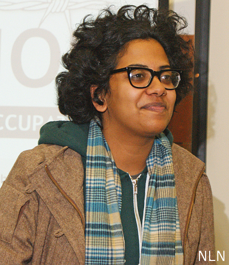 Lumumba Bandele, from the Malcolm X Grassroots Movement, and a teacher at Medgar Evers College (CUNY) in Brooklyn, spoke about providing support for incarcerated political activists in the U.S. He said that the description of life on the West Bank reminds him of stories he heard about life in Apartheid South Africa and that the Palestinian freedom movement should be supported. The international struggle against illegal detention, where indigenous peoples are criminalized, must be supported. There are many political prisoners in U.S. prisons today. In COINTELPRO the FBI documented their plots against community workers. Activists want to free their freedom fighters. We must control the language in the dialogue and educate the community. Hip-Hop is now being used to connect people around the world and teach people about freedom fighters, from all over, that are in prison. We should be speaking to new people, not the same ones again and again, who already agree with us. When speaking to our community, strategize. He quoted Fidel Castro saying that, “solidarity is a verb”, you have to be doing something or there is no solidarity.