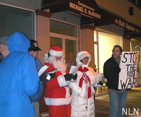 On December 21, the Winter Solstice, anti-war activists were joined by Santa and Mrs. Claus. The group visited the New Dorp Lane office of Representative Mike McMahon (D, NY-13). While there, the activists asked that Santa re-consider giving any holiday gifts to the congressman.