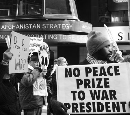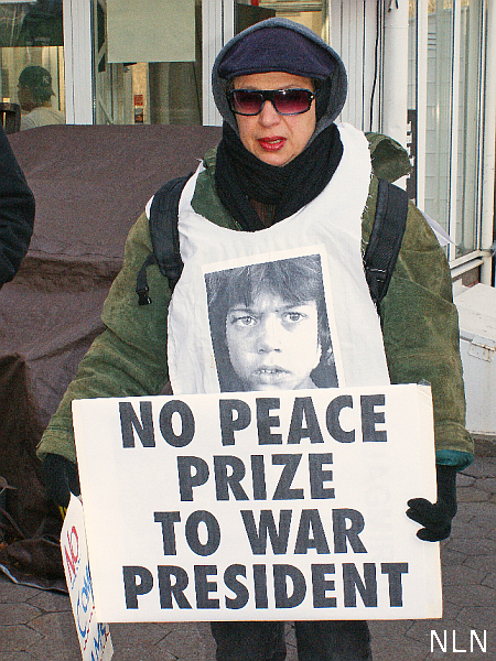 “Today we march with coffins and the faces of Afghan victims of war as a reminder of the human costs of war and to protest the giving a ‘peace’ prize to a commander-in-chief who is brazenly escalating war. We stand in solidarity with people around the world who are protesting this award. We march because we believe that war is never the answer, that it is a failure of the imagination, something to be mourned and resisted instead of celebrated and extolled.”