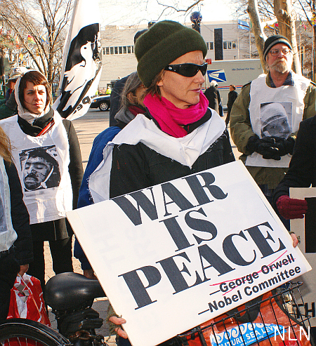 NEW YORK — On December 10th, as Obama was receiving his Nobel Peace Prize, the War Resisters League, with support from Veterans for Peace, World Can’t Wait, and CodePink, organized a mournful, slow walk, single file, across Manhattan from 1st Avenue and 47th Street, west on 42nd Street, to the Recruiting Station at Times Square. About 40 people carrying signs that read, “No Peace Prizes to War President” and “War Is Peace” with George Orwell’s name crossed out and Nobel Committee in it’s stead. Four coffins were carried, one draped with an American flag. Some wore photos of wounded Afghan civilians. The Veterans for Peace led with their flags showing a peace dove, flying in the breeze. All the while a drummer slowly beat a drum. Some handed out leaflets explaining why the procession was taking this walk.