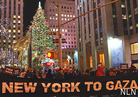 NEW YORK — On December 27, the first anniversary of Israel’s brutal attack on Gaza that left 1,400 dead (mostly civilians), thousands wounded, and hundreds of thousands homeless, 2,000 people met in New York’s Times Square. The throng marched through streets filled with New Yorkers and tourists in holiday mode, passed crowded Rockefeller Center, and ended at the Israeli Consulate at 42nd Street and 2nd Avenue. Participants represented all ages and all racial and ethnic groups. The march was timed to coincide with marches in solidarity with the people of Gaza that are taking place all over the world.