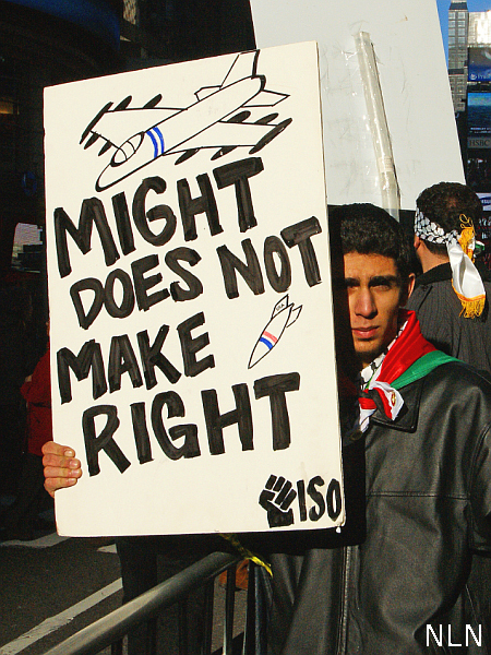 The Gaza Freedom March, expected to take place in Gaza on January 1, is bringing over 1,400 people from all over the world together to demand that Israel end the blockade of Gaza that is stopping building supplies — needed to rebuild the homes, schools, and hospitals destroyed by ‘Operation Cast Lead’ — food, medicine, school supplies, and fuel from reaching the people there. Without fuel they cannot run their water system. Gazan babies are being born blue because of the nitrates in their water which is coming from raw sewage. Health specialists have stated that 95 percent of the water is unfit for human consumption. A variety of observers regard the Israeli siege of Gaza as an act of genocide. Outside the Israeli Consulate in New York, the marchers demanded an end to the blockade which protesters argue is a violation of international law.