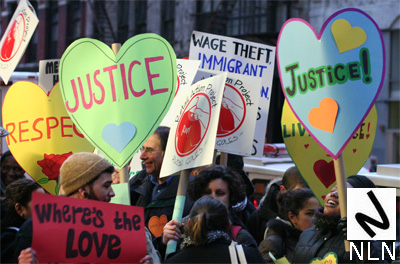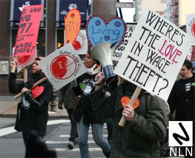 On Feb. 3, 2010, community groups, labor leaders and elected officials representing over a dozen groups joined these retail workers in the “March of Hearts” in SoHo against stolen wages and unpaid overtime. The two-hour march down Broadway was organized by the Retail Action Project (RAP), a community-labor partnership of the Retail, Wholesale and Department Store Union (RWDSU/UFCW) and Good Old Lower East Side (GOLES). RAP is calling on Shoe Mania and Mystique to pay its workers millions of dollars in back wages.