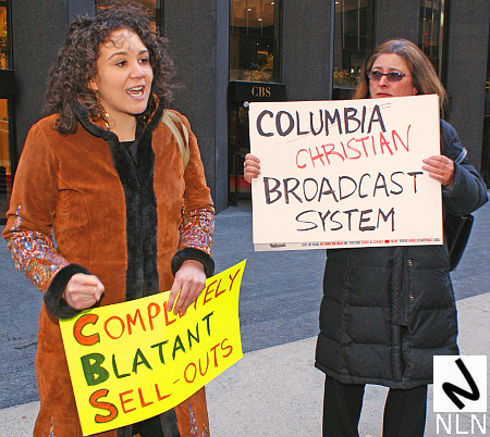CBS treated the demonstrators disdainfully. One of the participants made the point that CBS accepted, and is airing an advertisement from a Christian fascist organization but they are refusing to accept petitions from people who represent and care about women. Another said that we are in a dangerous situation in this country when a major mainstream institution is in league with a blatantly fascist organization that is sexist, homophobic, and calls gay people an abomination. Not so long ago a group like Focus on the Family was considered on the lunatic fringe. Today they’re mainstream and Obama and Hillary Clinton go to their prayer breakfast.