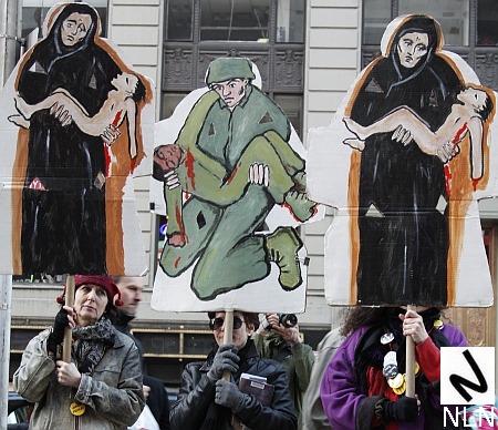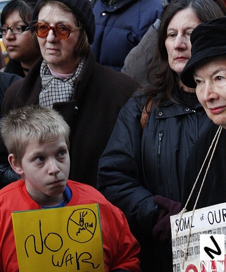 NY1 covered the protest and one image from their coverage struck this observer as both indelible and archetypal. A protester turned to the NY1 videographer and said, “Yeah that’s a great idea. We’ve got a third war we’ll get ourselves into.”