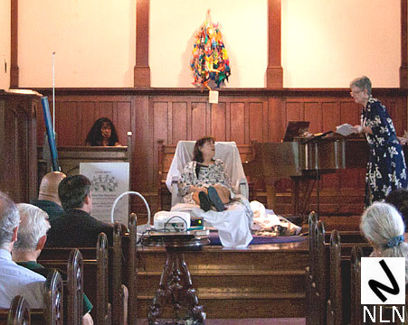 Mary Campbell and Kathy Santo enacted “Paper Crane Journey; Carrying Sadako’s Prayer”, the true story of Sadako Sasaki, a young victim of the Hiroshima atomic bomb disaster. She was only two years old when the bomb fell and seemed to be unharmed, but at the age of twelve she was diagnosed with “radiation sickness”, an aftermath of the bomb’s effects. She takes an old story to heart: If a sick person folds a thousand origami cranes the gods will grant her wish and make her well again.