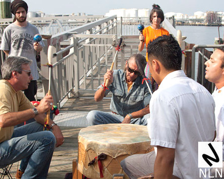 Following the presentation, participants walked in a solemn procession, carrying messages of peace down to the Kill Van Kull waterfront for communal song and reflection, where they were met by White Feather Ancestral Teachers of Wisdom, Native American drummers.