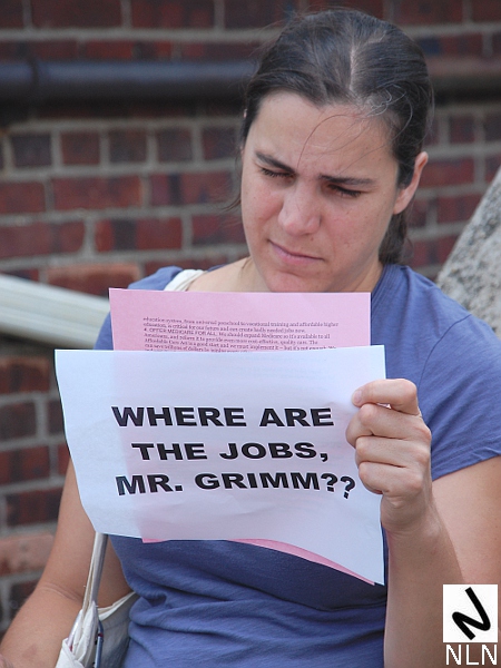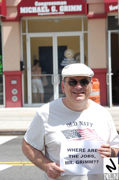 The “radicals” set up shop across the street from Grimm’s office, holding signs that read, “Where are the jobs Mr. Grimm?” and “Hands off my Medicare.”