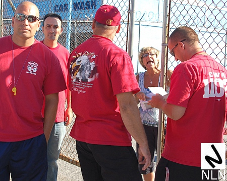 I turned left onto Lynhurst and then right onto Bay. A block down the road I saw a number of red t-shirts crossing the street. What timing. I pulled over and approached the group. About eight members of CWA Local 1102 stood outside a Verizon facility. Two women sat inside the fenced yard. They had a stack of envelopes on a card table. Seeing my camera one of the workers said, “You wanna take a picture of us getting our last paycheck?”