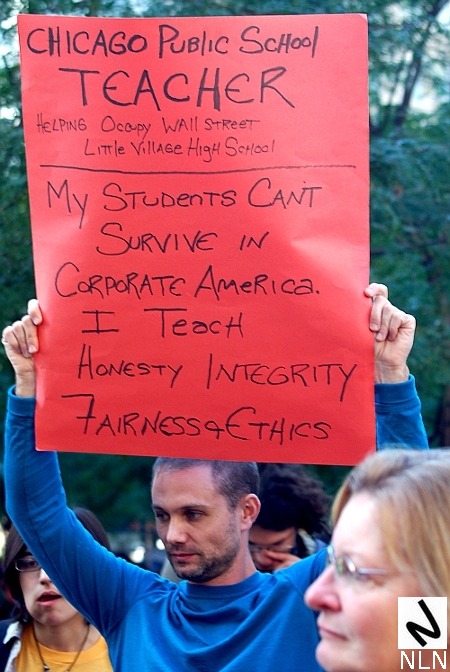 On Saturday a people-powered procession, over a thousand strong, moved out of Zuccotti Park and visited several Chase Manhattan Bank locations before venturing on to Washington Square — and later, Times Square. It was an energetic, fearless, heroic, jubilant and unified march — flanked by the now infamous scooter cops. Solidarity and diversity as reality — a crowd that refused to be cowed or controlled by any purveyors of gratuitous violence. It was an array of activists — young and old, student and worker. And the focus, the Cause, was crystal clear — the march was part of a “global day of action” that produced protests in London, Tokyo, Sydney, Toronto, and many other locales.