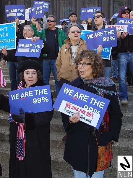 Tim Sheard, a novelist and fellow member of the National Writers Union, UAW Local 1981, found me as I was photographing protesters. I fired off as many frames as possible before nightfall — not being a fan of flash photography. As darkness descended and my existing light evaporated, Tim and I found ourselves surrounded by a sea of blue UAW placards — it was an excellent turnout. A bit later, a boisterous group of Make The Road New York activists set up shop next to us. In the distance, radiating out from the southeastern edge of Foley Square, I heard the angelic voice of Laura Newman as she performed “We are the 99 Percent,” a piece that she composed for Reverend Billy’s fully landscaped gospel choir.