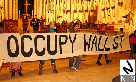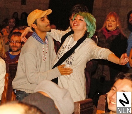 There was music and a number of speeches, mercifully short. Unfortunately, most of the speeches appeared to lack passion. The wars went largely unmentioned and this observer thought it might have been better to play a recording of the speech MLK made there exactly a year before he died — when he condemned the role of the U.S. in the Viet Nam War and urged the U.S. government to end the war. About three quarters of the way through the program an Occupier stood up and said “Mic-check.” Since loudspeakers are not allowed at the camp site the people there developed a method of communication that would allow everyone to hear what a speaker is saying. The person wishing to communicate with the crowd shouts “mic-check”, people repeat the phrase and then the person wishing to convey their thoughts to the crowd speaks in short sentences which are then repeated by the entire crowd so that everyone can hear what is being said. It is slow but effective. The Occupier in the church then began speaking about what he learned from King and the crowd repeated word for word. Another then stood and expressed his love for King and told about how he learned non-violence from him. Then another spoke of learning to use passive resistance to change society. And another discussed what King meant to her and how she learned to be a decent human being emulating the values King espoused. All this was communicated using the mic-check technique. In effect the Occupiers hijacked the program and brought their passions to the forefront. They brought their OCCUPY banner to the front of the room and placed it on the dais. To their credit, the program organizers did not interrupt them, and instead said, “Mic-check. We love you all.”