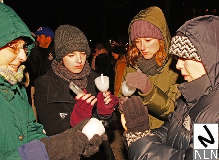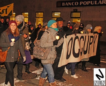 At 7 p.m. on January 15, candles were lit in countries throughout the world in an act of solidarity with Dr. King’s values and with the people who share them. In New York it was a bitterly cold night with sub-freezing temperatures, yet 500 people gathered on the steps of the Cathedral of St. John the Divine. The crowd was mostly Occupy Wall Street protesters and their allies, many of whom had walked there from Liberty Square in lower Manhattan — a 9 mile journey. After the candles were lit the crowd began a 10 block walk along Broadway, marching past Columbia University and making their way to Riverside Church. The streets were empty because of the cold but the participants walked slowly — singing and holding candles.