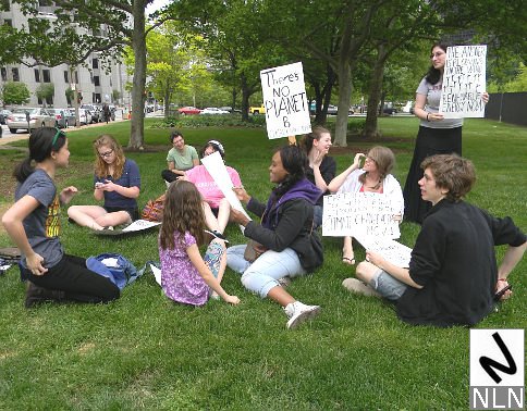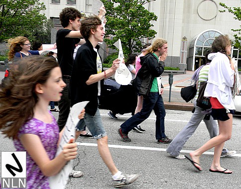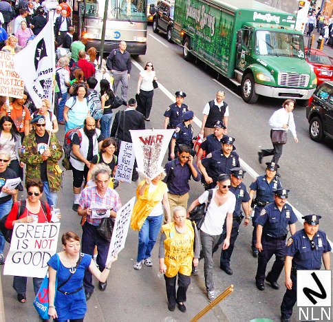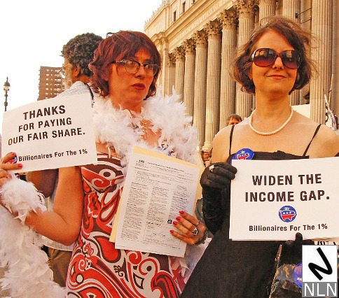 While the trade unions and community organizations on Staten Island were rallying, their counterparts on the other side of New York harbor were also protesting. The War Resisters League, The Granny Peace Brigade, The Rude Mechanical Orchestra and even Billionaires for the One Percent were all on hand to mark the passage of another tax day. The WRL and friends carried signs that read: “End the wars, then tax the rich…”