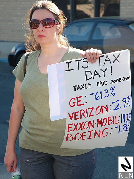 STATEN ISLAND, N.Y. — April 17, 2012. On Tax Day 2012 over 100 members of several New York City unions attended a demonstration outside Staten Island’s main post office — not to protest against paying taxes but to demand that corporations start paying their share.