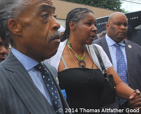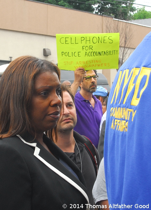 STATEN ISLAND, N.Y. — July 19, 2014. Photo: Reverend Al Sharpton (of the National Action Network) with Esaw Garner, widow of Eric Garner, at a protest held on Saturday, in the Staten Island neighborhood where Mr. Garner died while in police custody. Eric Garner died on Thursday, July 17, while being pinned to the ground by police during an arrest - a video shot by a friend of Garner’s shows the man being choked and crying out, “I can’t breathe” several times before he stopped moving or speaking. The Saturday rally and march was attended by hundreds of Staten Islanders. Police blocked traffic on Victory Boulevard and Bay Street, in the busy Tompkinsville section of the Island, to allow the large procession to march from the Mt. Sinai church rally site to the 120 Precinct. Two of the officers who arrested Mr. Garner are being investigated by the NYPD’s Internal Affairs Bureau - for using a chokehold on the victim. Below: New York City Public Advocate Letitia James at the Garner protest. |