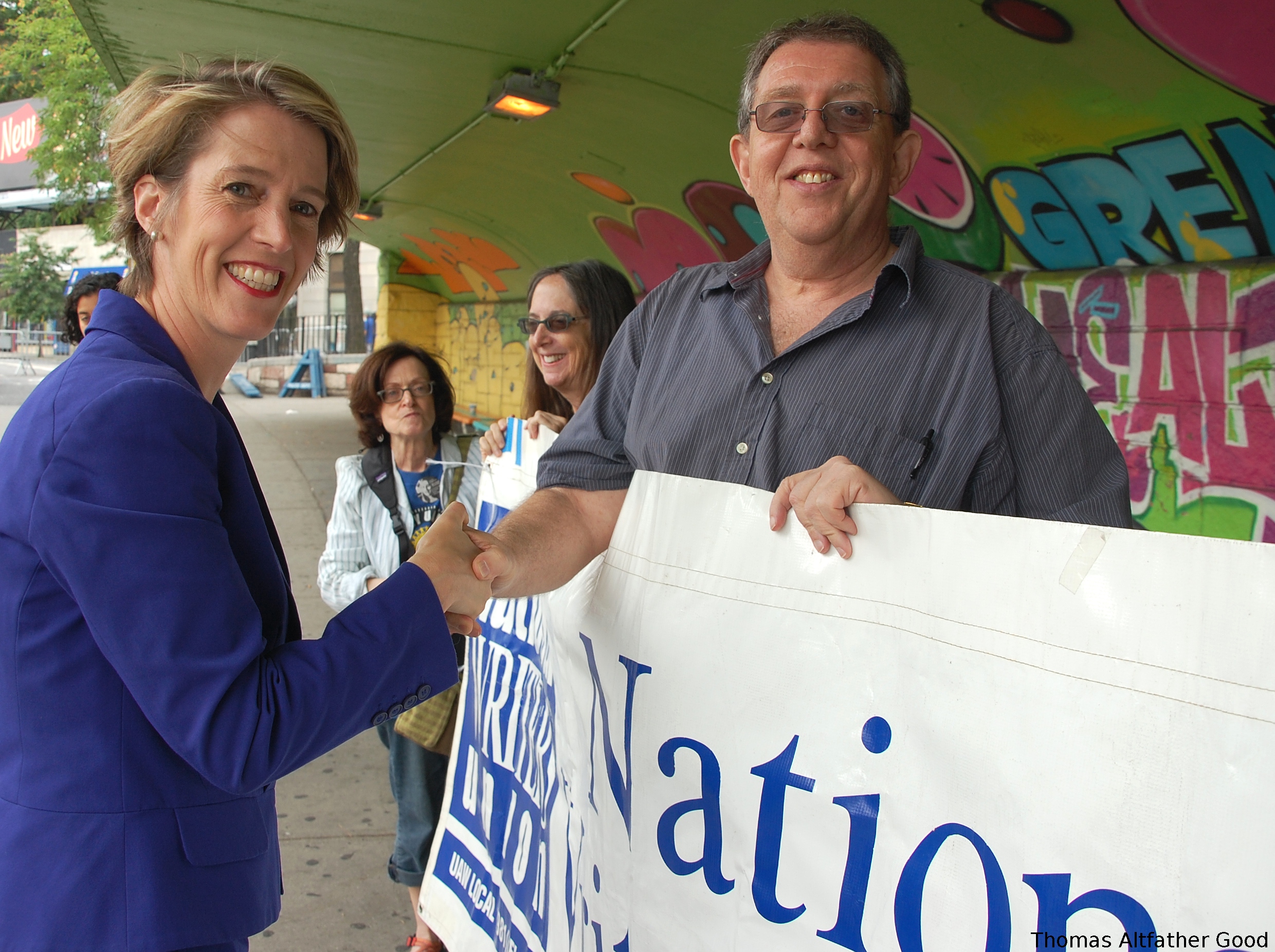 Gubernatorial candidate Zephyr Teachout with National Writers Union president Larry Goldbetter (Photo: Thomas Altfather Good) |